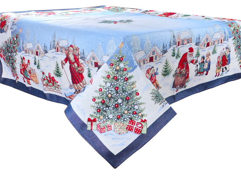 Скатертина гобеленова новорічна з люриксом Санта в селі 140х140 см 716-038
